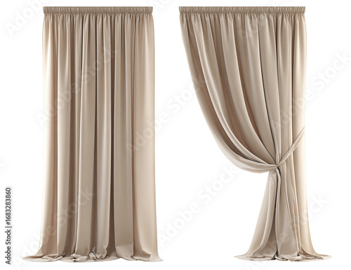 Beige curtains in a split view. Drapery panels, one open and one closed, with a soft, light tan color