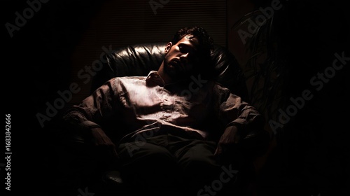 Fototapeta - A man sleeps deeply in a dark leather chair illuminated by dim light portraying a mood of exhaustion or quiet reflection