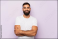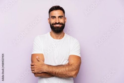 Stock photo of handsome bearded man smiling in white t shirt with arms crossed isolated