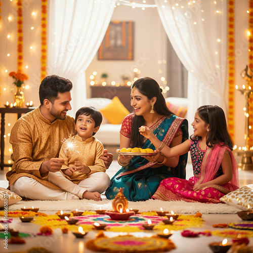 Fototapeta - Indian Family Celebrating Diwali – Festival of Lights with Traditions, Diyas, and Festive Joy
