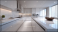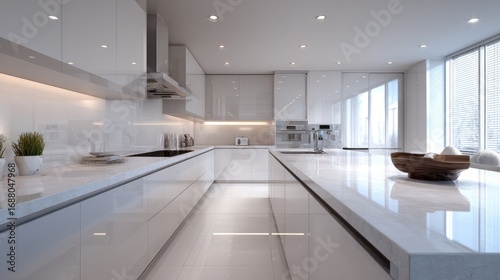 modern white kitchen, minimal design, glossy countertops, subtle warm lighting, ultra realistic detail