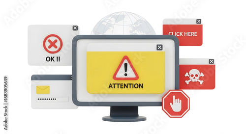>Plakat>Security Alert Digital Threats on a Computer Monitor with Pop-up Windows and Icons, Representing Cybersecurity Risks, Data Breach, and Online Safety, Isolated on a transparent background