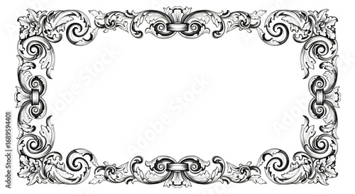 Ornate rectangular frame with floral and scroll designs in black and white on a white background