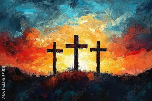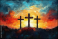 Three dark crosses standing on a hill against a vibrant, colorful sky with dramatic blue, orange, and yellow clouds at sunset or sunrise