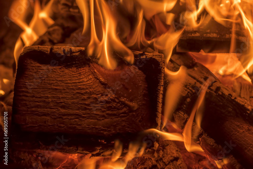 Fototapeta - Sosnowe polana płoną jasnymi, pomarańczowymi płomieniami, eksponując swoją fakturę powierzchni podczas palenia w ognisku. Ogień emanuje ciepłą poświatą z widocznymi językami wijącymi się i tańczącymi