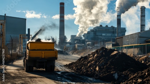 Industrial truck operation in urban manufacturing facility heavy machinery pollution smoke daytime setting industrial concept