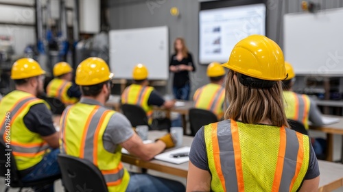 Construction workers attending meeting in industrial building
