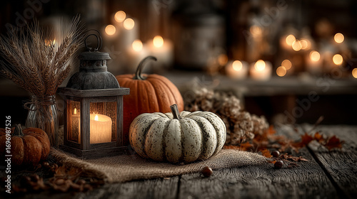 Fototapeta - Jesienna kompozycja z dyni, lampionu i suszonych roślin na drewnianym stole.