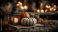 Jesienna kompozycja z dyni, lampionu i suszonych roślin na drewnianym stole.