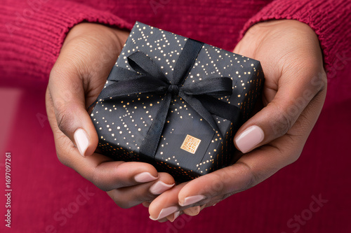 Fototapeta - Elegancki prezent w czarnym pudełku z kokardą w dłoniach – luksus, święta, niespodzianka