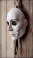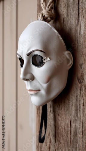 Fototapeta - White theatrical mask hanging on wooden wall with rope