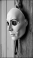 White mask with a red background. The mask is a close up of a woman's face. mask is white, highlighted on a red background