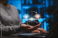 Fototapeta - Human and AI Knowledge Transfer and Collaboration Concept. Person interacting with icons showing human brain and AI brain, symbolizing artificial intelligence, machine learning, and knowledge exchange