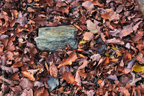 Fototapeta - Rezerwat Przyrody "Nad Groblą" (Park Krajobrazowy "Chełmy").Kamień wśród jesiennych liści pokrywających ziemię.