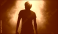 >Plakat>Silhouette of athletic man standing in front of spotlight with back wearing t-shirt and jeans, background orange smoke fog creating dramatic lighting effect posture confidence