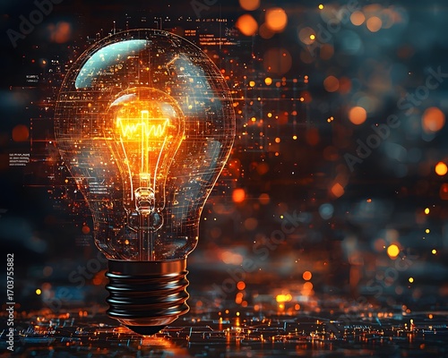 A luminous digital lightbulb glowing with data and circuits representing technological innovation data insights and revolutionary ideas