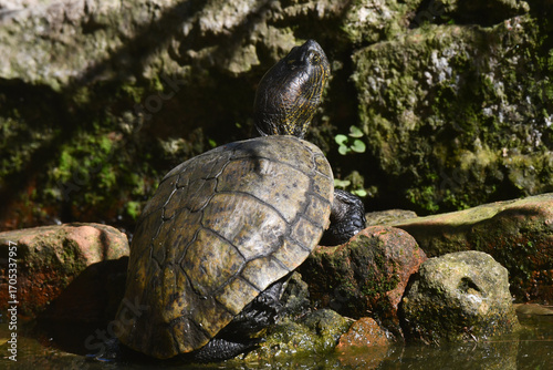 Fototapeta - Uma tartaruga tomando sol nas pedras do lago do jardim do Museu da República - Catete - RJ