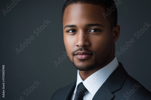 Fototapeta - A serious, handsome Black man in a suit looks directly at the camera.