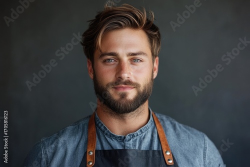 Fototapeta - Portrait of a handsome man with a beard, wearing a denim shirt and apron, smiling.