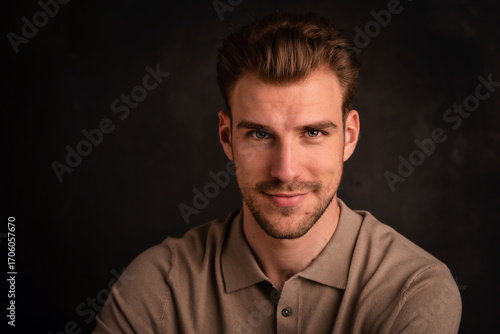Fototapeta - Headshot of a handsome young man against isolated dark background