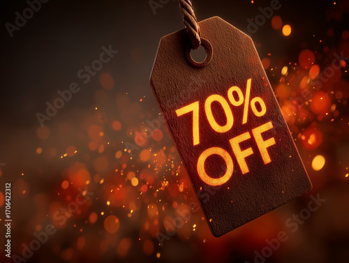 Ciemna metka z napisem "70% OFF" w centrum, unosi się w powietrzu. Jest otoczona przez latające iskry i pomarańczowe, rozmyte światła w tle.