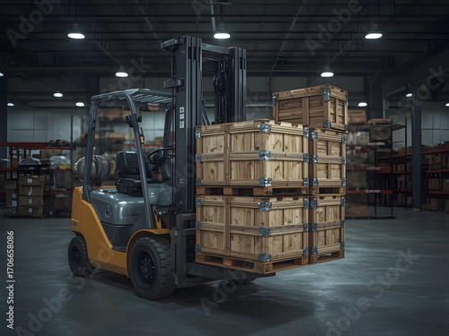 >Plakat>Forklift and Goods Transportation: A dynamic perspective captures a forklift in operation, meticulously moving crates within a warehouse setting, ready for dispatch and distribution.