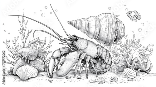 Fototapeta - Kolorowanki dla dzieci – Zwierzęta morskie: delfin, żółw, rekin, krab, meduza i inne stworzenia oceanu do druku