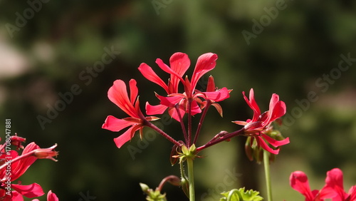 Fototapeta - Piękne, czerwone płatki kwiatów pelargonii w słońcu