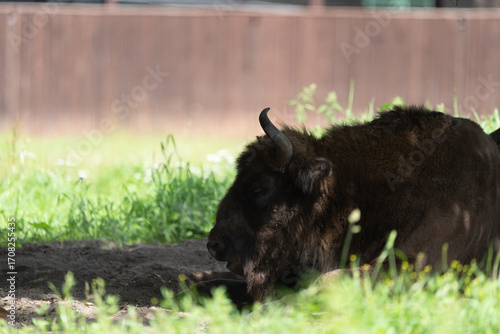 Fototapeta - żubr leżący w trawie w puszczy białowieskiej w rezerwacie