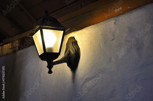Fototapeta - Klasyczna, czarna, zewnętrzna lampa ścienna rzuca ciepłe, miękkie światło na białą, otynkowaną ścianę pod drewnianym sufitem, tworząc przytulny nastrój w wystroju domu, wejściach lub przestrzeniach.