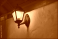 Klasyczna, czarna, zewnętrzna lampa ścienna rzuca ciepłe, miękkie światło na białą, otynkowaną ścianę pod drewnianym sufitem, tworząc przytulny nastrój w wystroju domu, wejściach lub przestrzeniach.