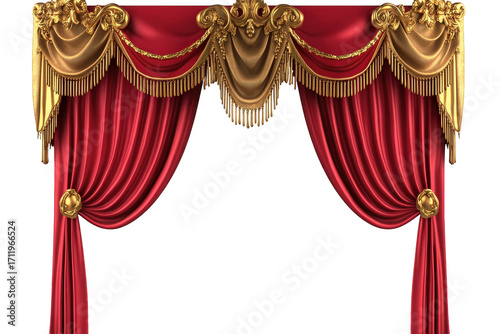 >Plakat>Elegant red and gold curtain isolated on transparent background, showcasing luxurious drapery and ornate details, perfect for theater, stage, and interior design concepts