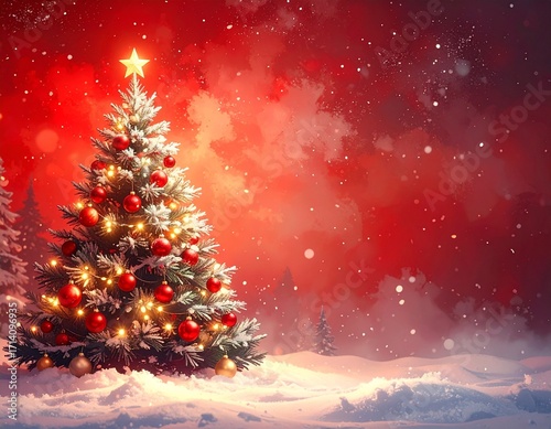 Fototapeta - Choinka udekorowana czerwonymi bombkami, lampkami i świecącą gwiazdą stoi na śniegu na czerwonym tle. Bożonarodzeniowe tło z miejscem na tekst