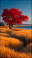 Wibrujący jesienny krajobraz z samotnym drzewem o purpurowych liściach. Stoi na polu złotych traw. W tle dom nad jeziorem i błękitne niebo.