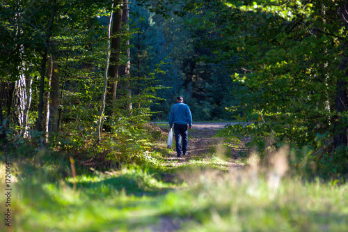 Fototapeta - Mężczyzna grzybiarz spacerujący po lesie z reklamówką.