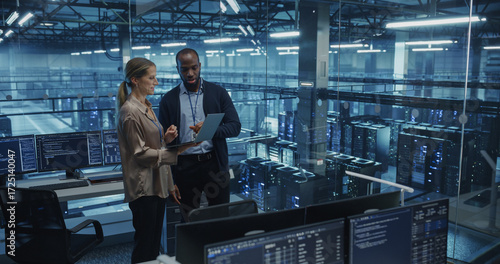 Fototapeta - Male Cloud Architect and Female Database Engineer Review Data Storage Protocols on a Shared Laptop in a Data Center. Team Strategizing Ways to Improve Service for Enterprise Clients