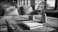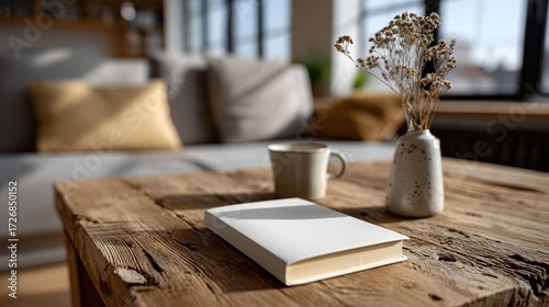 Table en bois rustique avec livre ouvert et décoration minimaliste
