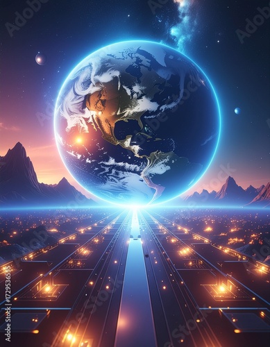 Fototapeta - Futurystyczna ilustracja przestawiająca planetę z niebieską poświatą widoczną z innej planety