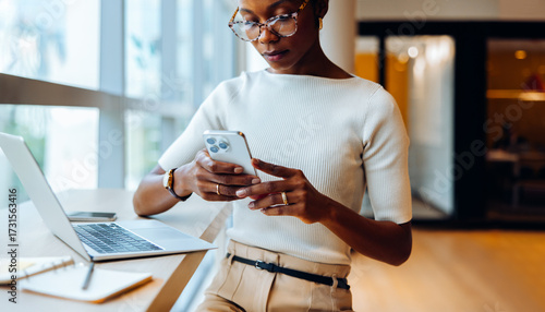 Fototapeta - Businesswoman reading her smartphone while working on her laptop at a desk