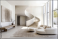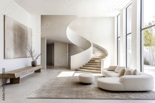 Stylish elegant sofa in minimalist, scandinavian home interior design of modern living room with staircase.