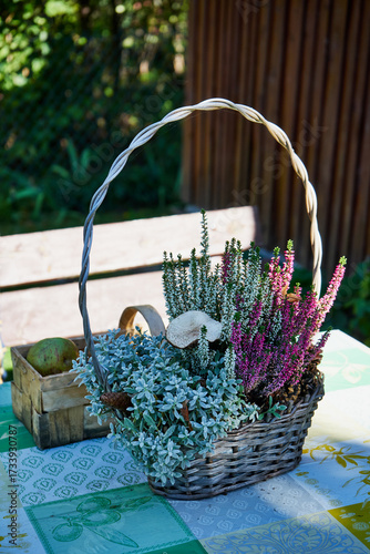 Blossom erica heather in a basket, autumn card with pink heather flowers