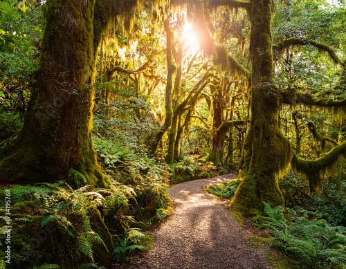Fototapeta - golden sunlight streams through a lush vibrant rainforest illuminating a path winding through ancient trees draped in vibrant flora and moss