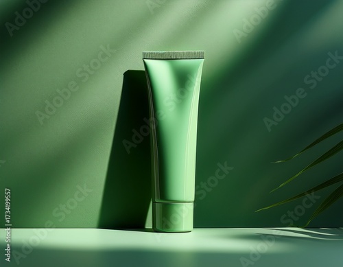 a green tube of lotion or cream stands alone in soft light casting a shadow on a pale green surface