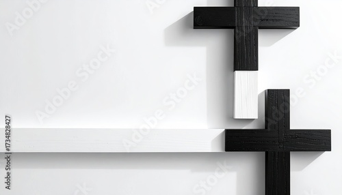 Minimalist composition featuring black and white crosses and rectangular elements against a white background, casting subtle shadows