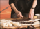 >Plakat>A person spreads a thick chocolate filling on Cozonac dough with a small knife on a wooden table. Rolled dough pieces are ready for baking next to the filling