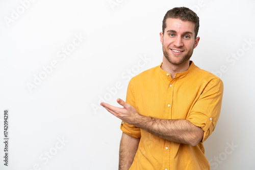 Fototapeta - Young caucasian man isolated on white background presenting an idea while looking smiling towards