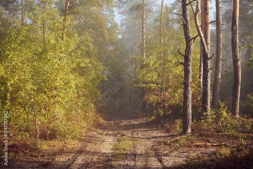 Fototapeta - mgła,jesień,leśna droga