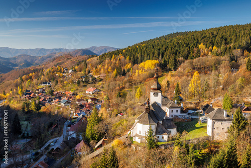 Fototapeta - The Spania Dolina village in Slovakia, Europe. Picturesque village with historic church nestled in colorful autumn hills under a bright blue sky, evoking tranquility and timeless beauty.