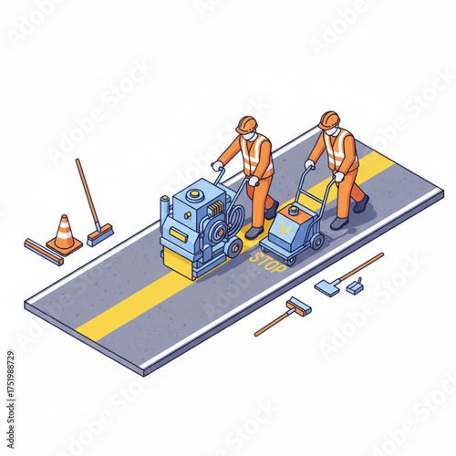 Fototapeta - Isometric Road Painting Crew with Equipment – Tim Marka Jalan Isometrik Vector