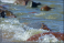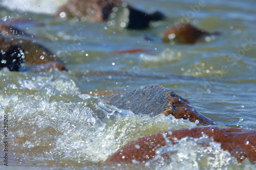Fala rozbryzguje się o kamienie w wodzie, w tle nieostra woda, inne kamienie, małe kropelki wody,niektóre nieco nieostre, w powietrzu